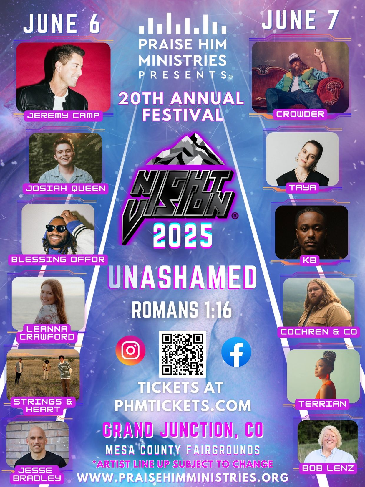 NightVision is an annual two day Christian concert festival on the Western Slope. This year is our 20th Anniversary of NightVision! We are happy to announce that Jeremy Camp and Crowder are the two headliners. The festival includes water booths where you can purchase water, VIP Lounge for those who want to see the concert in style and have a meet and greet with artists, Merchandise Tent that sells Praise Him Ministry merch as well as artist merch, Kids Corner where kids 12 and under can make crafts, play games and jump in bounce houses and an Evangelism Tent where you can receive prayer or be baptized! There will be over 15 vendors with a variety of food and items to sell. There is something for the whole family. If you are a camper, you can purchase tent camping tickets and stay onsite for the whole event. You don't want to miss this amazing experience. Buy your tickets today!